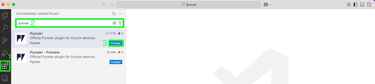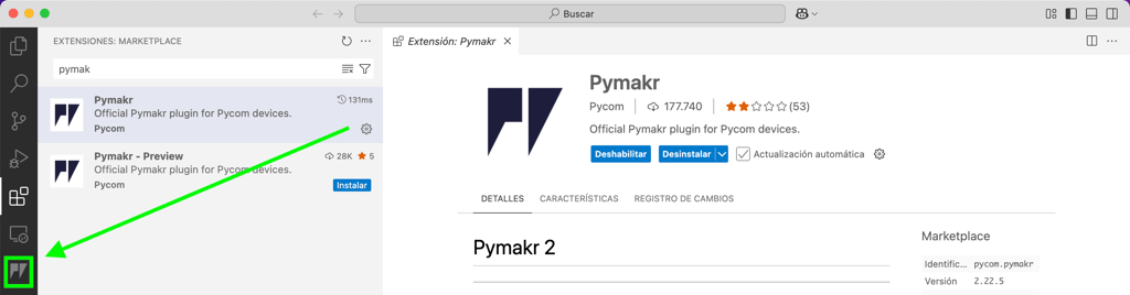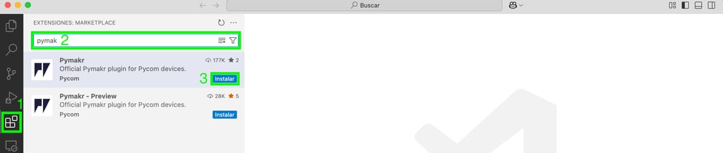 Buscar la extensión Pymakr. (¿Qué es Pymark? Te lo cuento más abajo)
