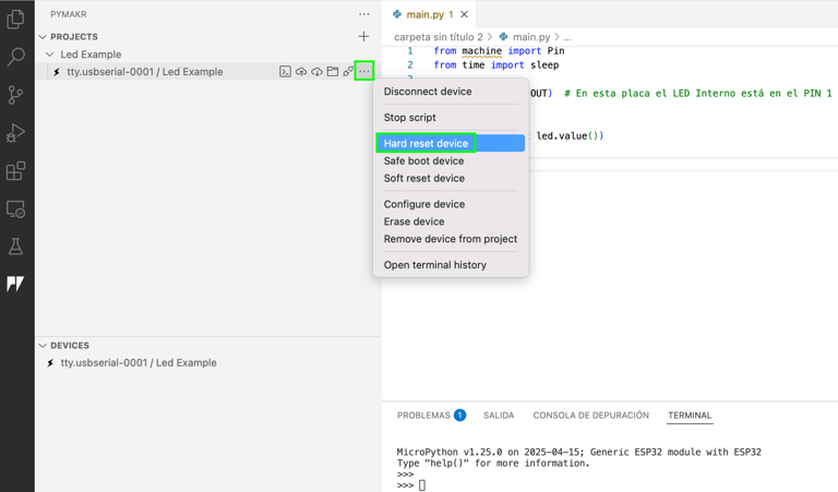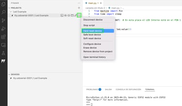 Una vez que has conectado la placa y tienes el terminal abierto vamos a hacer los siguientes puntos. Recuerda que puedes consultar la documentación oficial de micropython si necesitas alguna información adicional.